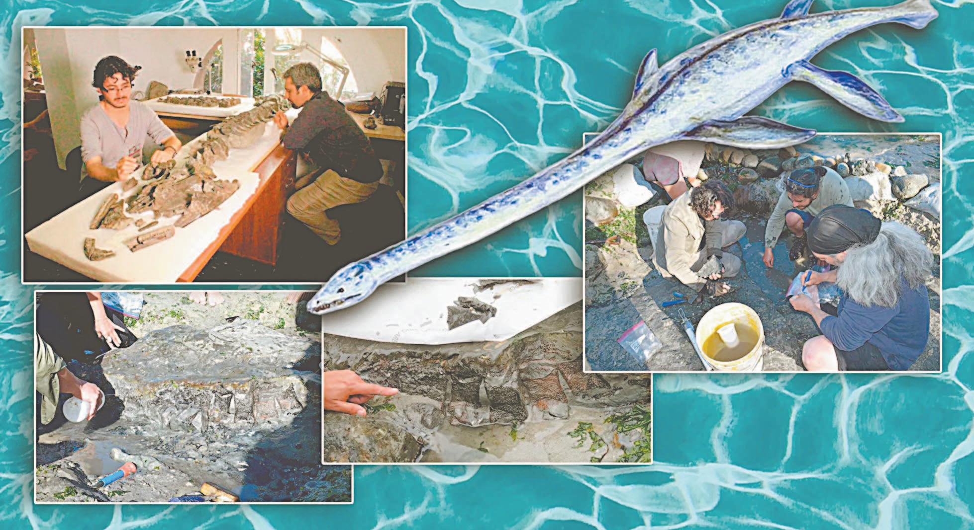 Con los zapatos y pantalones empapados, los expertos extraen de las rocas los remanentes de un elasmosaurio , un habitante marino en la era del Cretácico, que comenzó hace 145 millones de años y terminó hace 66 millones.