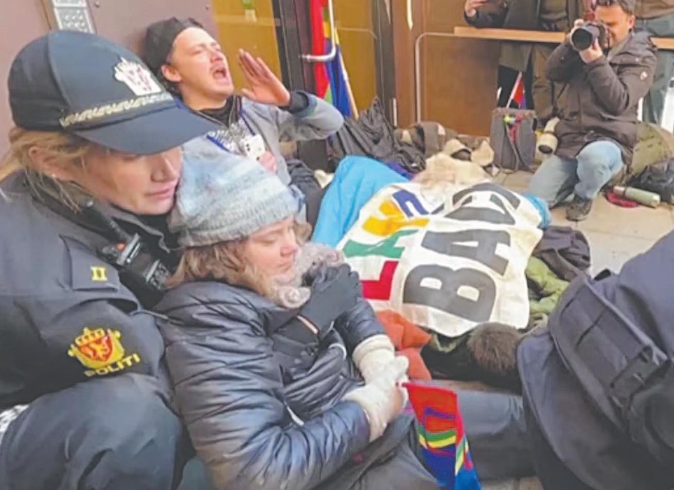 La activista Greta Thunberg, junto a otros manifestantes bloqueó los accesos a varios ministerios en Oslo en forma de protesta debido a la construcción de aerogeneradores que afectarían una reserva de renos, la joven fue desalojada cargada por mujeres policías para que liberara dichos accesos.