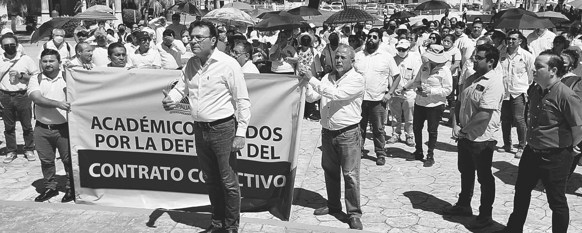 ALREDEDOR de 300 integrantes del Sindicato Único de Personal Académicode la Universidad Autónoma de Campeche marcharon hasta la explanada principal; de NO haber acuerdos, la huelga estallará este siete de marzo.- (Lucio Blanco)