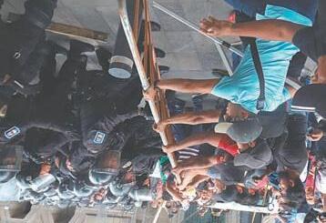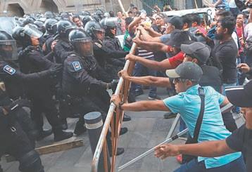 En el enfrentamiento, los maestros disidentes también trataron de derrumbar las vallas metálicas de 3 metros que fueron colocadas por el Gobierno desde hace tres semanas para proteger Palacio Nacional.
