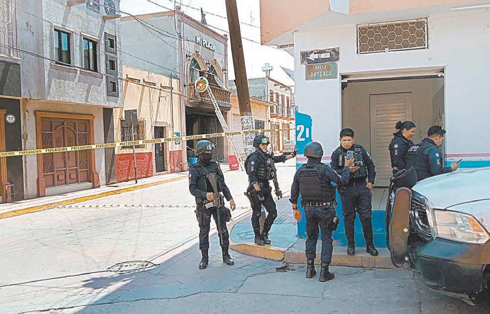 Los agresores dispararon ar mas de fuego, lanzaron un arte facto explosivo y rociaron com bustible en el establecimiento ubicado en la calle zona Centro de esta ciudad. El negoció ardió en su totalidad. El saldo del crimen fue de al menos dos personas muertas, un hombre y una mujer, y tres más he ridas. El suceso, que se registró al mediodía de ayer, causó terror en tre comerciantes y consumidores. Elementos de Bomberos y Pro tección Civil acudieron en auxilio de las víctimas y para combatir el fuego. Encontraron dos personas fallecidas y tres más fueron tras ladadas a un hospital. Un policía sufrió heridas al brindar ayuda.