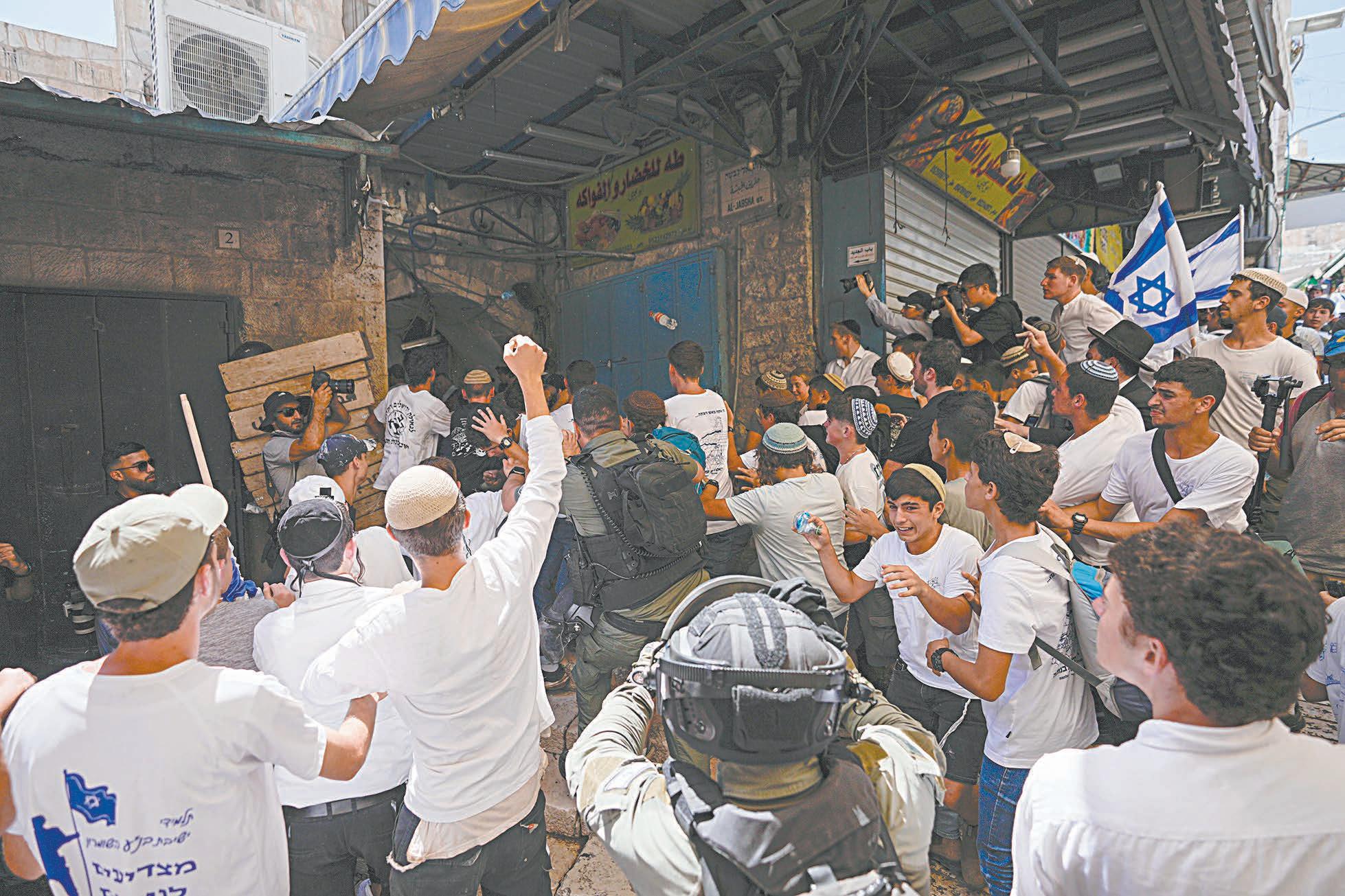 Tras cruzar la Puerta de Damasco, muchos de estos israelíes golpearon con fuerza las puertas cerradas de las tiendas de los comerciantes palestinos, que como cada año, se ven obligados a cerrar sus negocios horas antes de la Marcha de las Banderas, a fin de evitar enfrentamientos y agresiones.