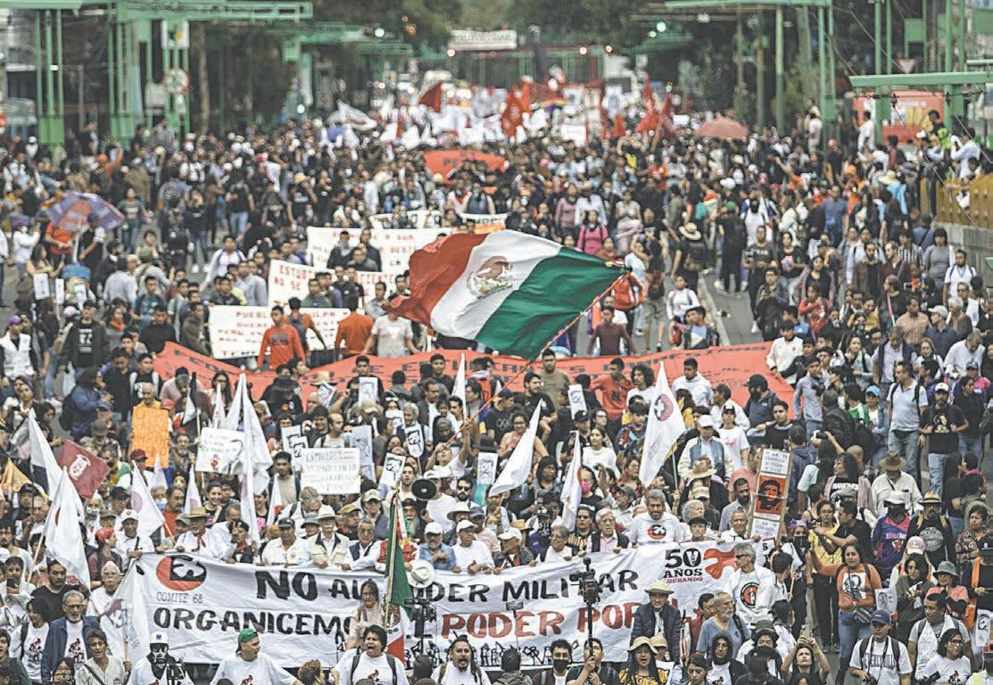 A 55 años de la matanza de estudiantes y civiles en Tlatelolco, el Comité del 68 marcha de la Plaza de las Tres Culturas al Zócalo para que el 2 de octubre NO se olvide; contienen a “anarquistas” / México y EE.UU. se sientan a la mesa en el Palacio Nacional para tratar la migración y el tráfico de fentanilo / Completan el tramo 2 del Tren Maya, que va de Escárcega a Calkiní, Campeche + República 3, 5 y 6