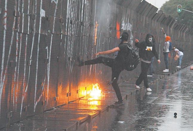 Con martillos, mazos, a patadas, petardos y bombas molotov, el autodenominado “Bloque Negro” intentó sin éxito derribar el muro metálico colocado para proteger diversos inmuebles históricos, en este caso Palacio Nacional.