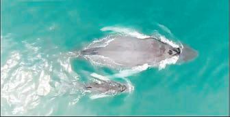 Una vez que se alimenta, la cría -de unos 900 kilogramos- nada hasta la superficie para tomar aire en el golfo de Cupica, ubicado en una región del Pacífico colombiano, declarada reserva de la biosfera por la Unesco a mediados de junio.