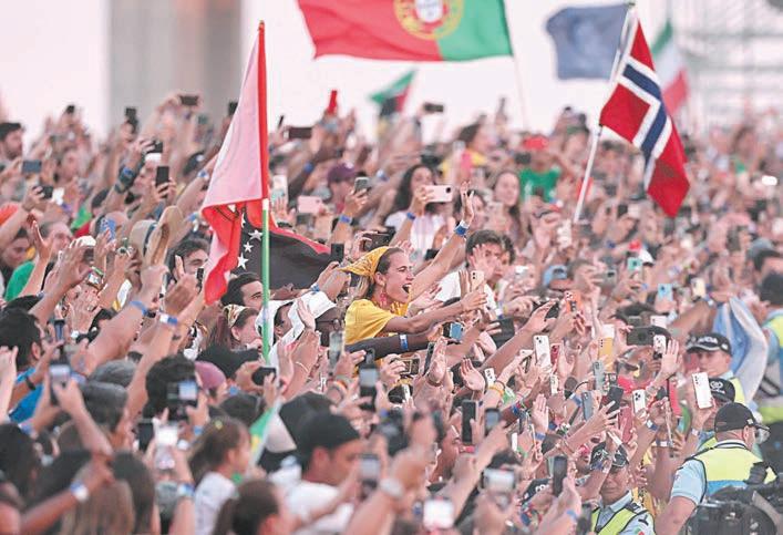 hijos. Todos, todos, todos, sin exclusión”.El Sumo Pontífice fue recibido por unos 200 mil jóvenes en el Santuario Fátima. La cifra de personas presentes en la inmensa explanada dispuesta para el evento junto al río Tajo fue informada por el Vaticano, según estimados de autoridades portuguesas. (AFP) “La Iglesia no tiene puertas, para que todos puedan entrar”, dijo Francisco.
