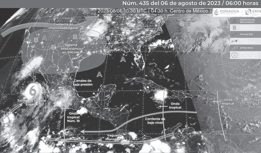 La circulación de Eugene seguirá ocasionando chubascos, rachas de viento de 40 a 60 kilómetros por hora (km/h) y oleaje de 1 a 3 metros de altura en la costa occidental de Baja California Sur; se desplaza rápidamente hacia el Oeste-Noroeste y en las