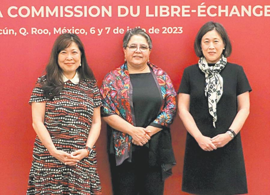 CIUDAD DE MÉXICO.- Ayer, la secretaria de Economía de Mé xico, Raquel Buenrostro; la re presentante Comercial de Estados Unidos, Katherine Tai, y la ministra de Comercio Internacional, Promo ción de Exportaciones, Pequeñas Empresas y Desarrollo Económico de Canadá, Mary Ng, emitieron una Declaración Conjunta sobre el Tra tado entre México, Estados Unidos y Canadá (T-MEC) tras el tercer encuentro de la Comisión de Libre Comercio, que indica que las mi nistras “subrayaron la importancia de resolver controversias mediante los mecanismos del Tratado para brindar mayor certeza, mejorar la competitividad y evitar interrupcio nes innecesarias en el comercio”. En el documento fechado por la Secretaría de Economía mexicana el 7 de julio, se aseguró que durante la reunión se evaluaron los avances en la implementación del acuerdo. Contrario a lo que ocurrió en las dos primeras reuniones de la Co-