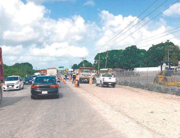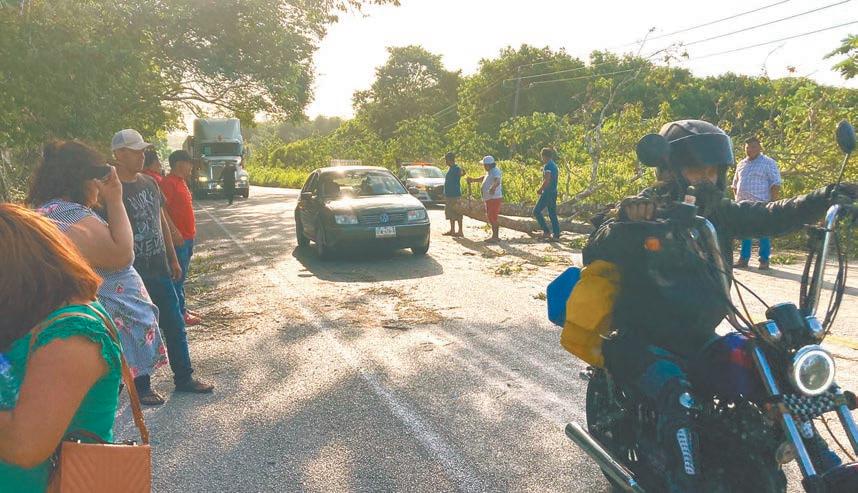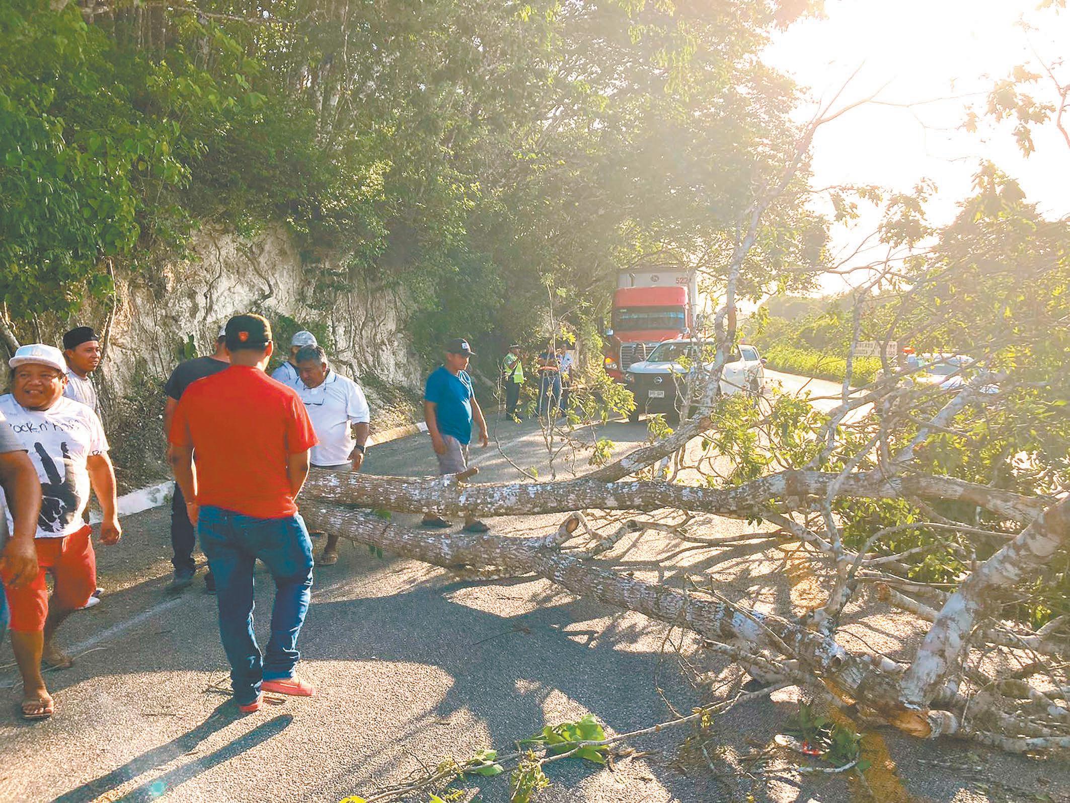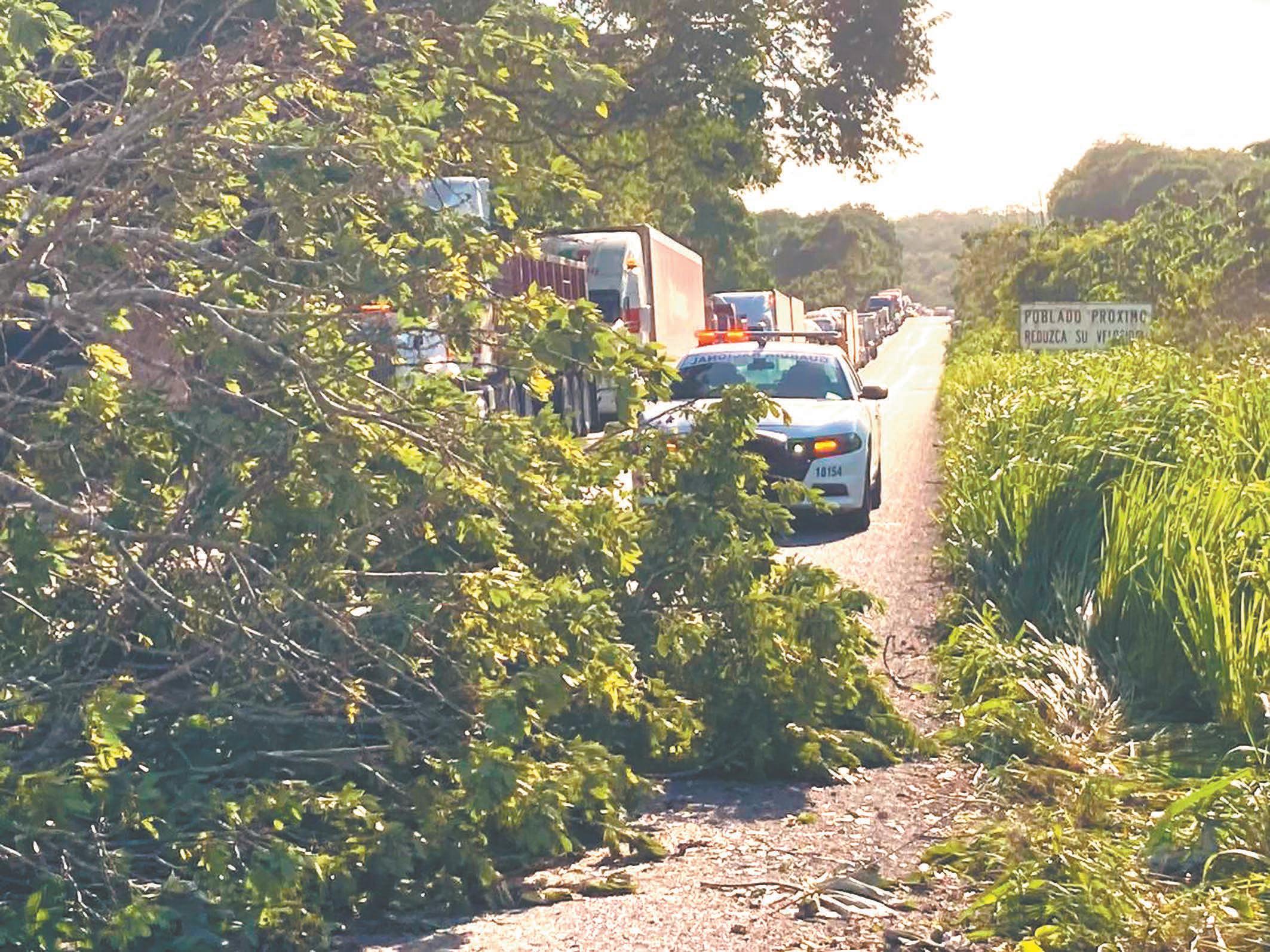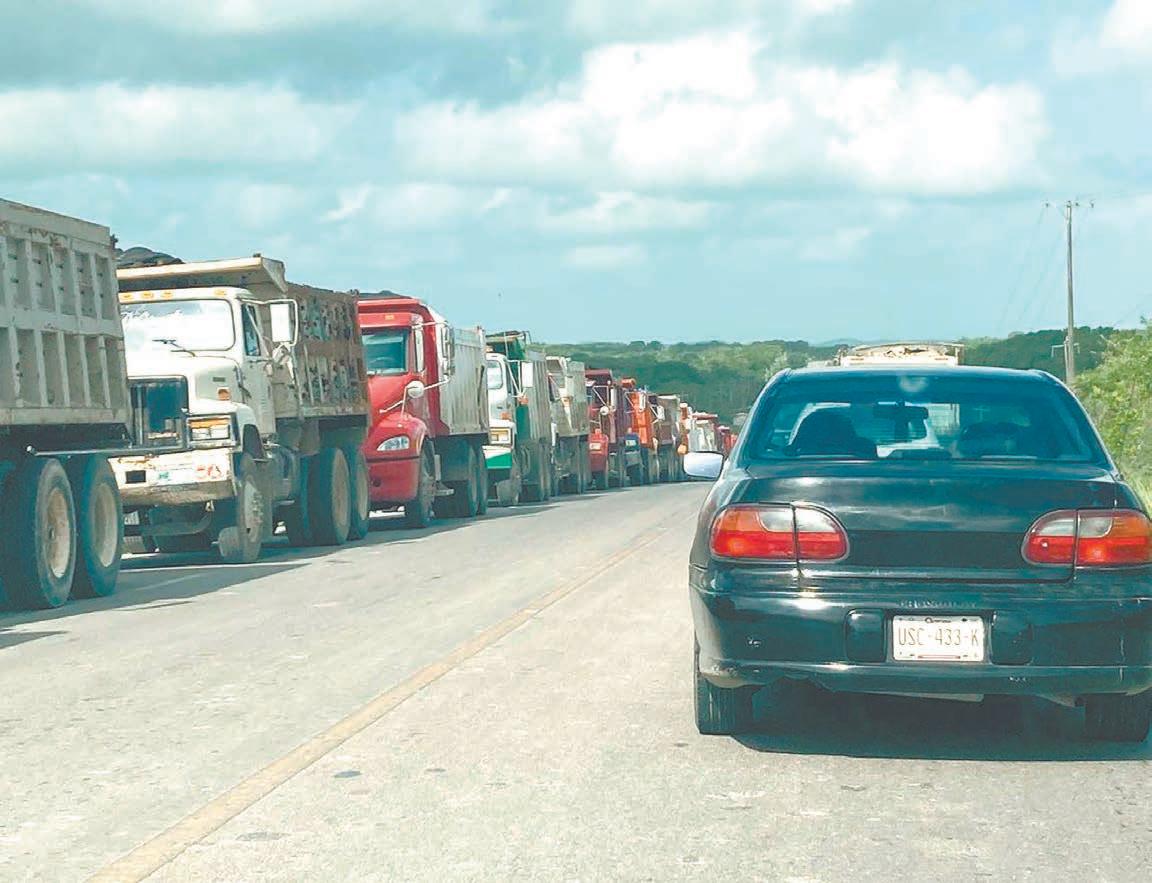 DURANTE tres horas los quejosos impidieron la circulación, lo que generó se formaran largas filas de vehículos, principalmente de carga del Tren Maya, y de varios tráilers, que se dirigían hacia el Norte de la Entidad.- (Abraham Cohuó)