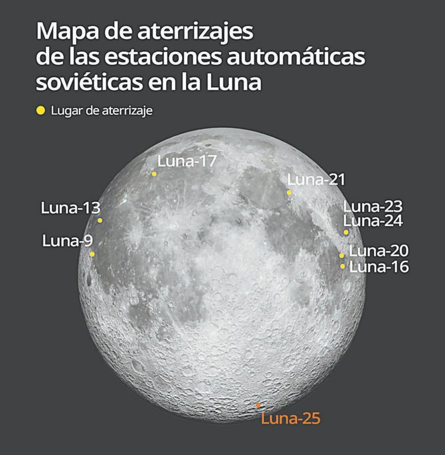 Luna-25, heredera de la soviética Luna-24, es la tercera nave espacial en recabar muestras de la superficie lunar en agosto del 1976, espera encontrar agua en forma de hielo en nuestro satélite.