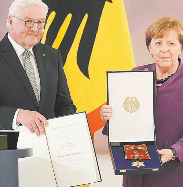 “Durante 16 años, se puso al servicio de Alemania con ambición, sabiduría y pasión”, declaró el presidente socialdemócrata Frank-Walter Steinmeier, antes de entregar la Gran Cruz de clase especial a la antigua Canciller conservadora.