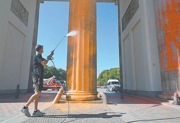 BERLÍN.- Activistas climáticos alemanes rociaron pintura naranja en la Puerta de Brandeburgo de Berlín ayer por la mañana para instar al Gobierno alemán a tomar medidas más urgentes contra el cambio climático.