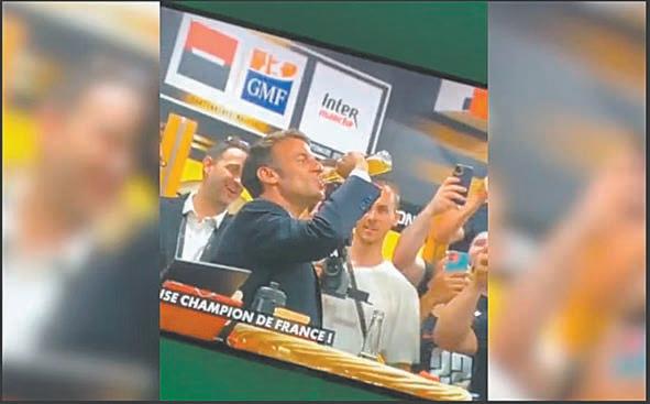 El presidente francés, Emmanuel Macron, mostró que es un buen bebedor y qué mejor forma de hacerlo que con una Corona Tras la victoria del Toulouse en la final del Top 14 de rugby, el sábado, Macron llegó al vestuario para felicitar a los jugadores y unirse a la celebración.