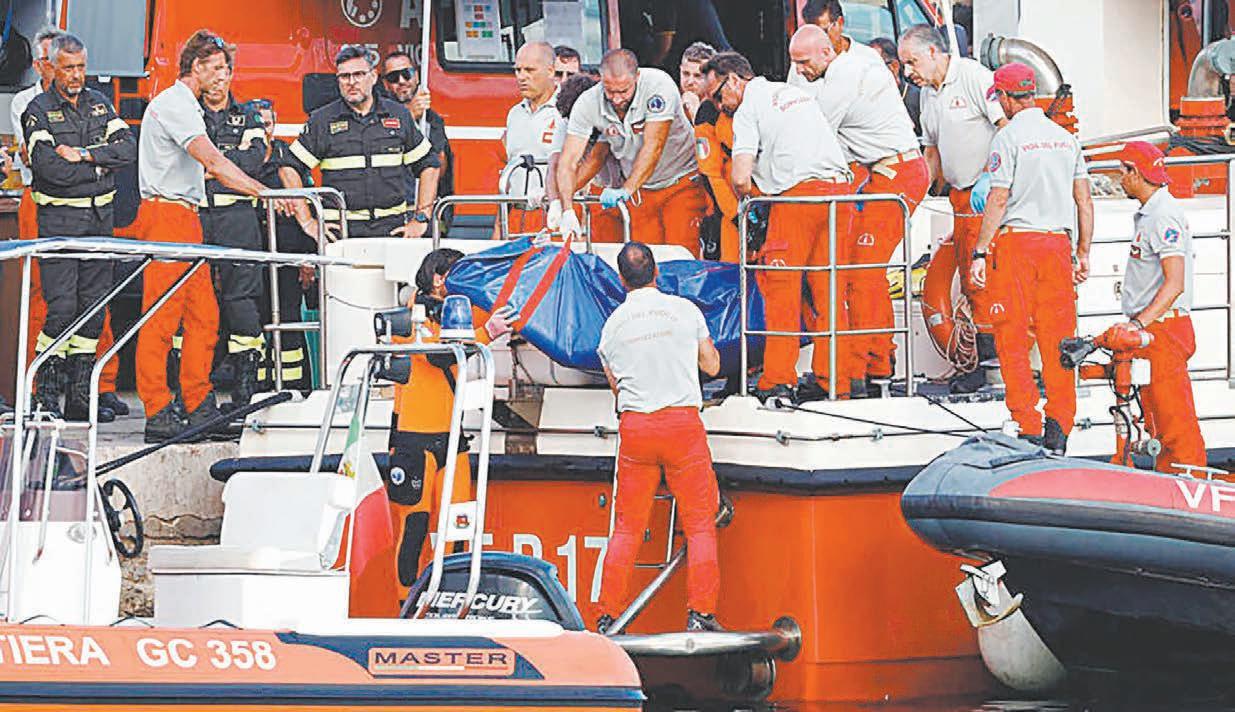 PORTICELLO.- Cinco cuerpos fueron hallados ayer entre los res tos del yate Bayesian, los del poderoso empresario Mike Lynch, conocido como tes británico, el de su hija Hannah, y el de otros tres de los invitados que los acompañaban durante sus vacaciones por Europa. La lujosa embarcación se hun dió el lunes en Sicilia y sólo falta por recuperar el cuerpo de una de las seis víctimas del naufragio. Los cinco cadáveres, hallados ayer elevan el balance de víctimas a seis muertos, tras la recuperación el lunes del primer cadáver. Poco antes de que se anunciara el hallazgo de dos cuerpos el día de ayer, un periodista de media docena de embarcaciones abandonar en cuestión de minutos el puerto de Porticello, lugar del naufragio al Este de Palermo. Algunos regresaron más tarde y depositaron dos bolsas para cadáve res en una carpa situada en el muelle. Horas antes de la tromba marina ocurrida el lunes al amanecer, se estaba llevando a cabo una fiesta en el Bayesian tros de eslora con bandera británi ca, anclado a 700 metros del puer to de Porticello, con 12 pasajeros y 10 tripulantes a bordo.