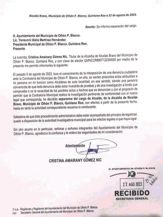 En la red social X, difundió una carta dirigida al presidente Andrés Manuel López Obrador, donde manifiesta que la decisión fue tomada “en virtud de los contextos actuales”, sin especificar a qué se refiere.