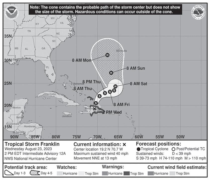 SANTO DOMINGO.- La Tormenta Tropical Franklin provocó inundaciones y aludes en la República Dominicana ayer luego de tocar tierra firme en la región sureña del país, y causó la muerte de por lo menos una persona y heridas a otras dos. La tormenta comenzó a alejarse lentamente ayer por la tarde de la isla de La Española, que la República Dominicana comparte con Haití, tras descargar fuertes lluvias durante varias horas. Los meteorólogos advirtieron que la tormenta podría arrojar hasta 30 centímetros (12 pulgadas) de lluvia en la República Dominicana, con un máximo de 41 centímetros (16 pulgadas) en las regiones occidentales y centrales de la nación. En tanto, se prevén hasta 10 centímetros (4 pulgadas) de lluvia para Haití, y las regiones orientales podrían recibir hasta 20 centímetros (8 pulgadas).