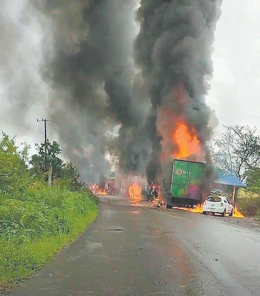 INTEGRANTES del Frente Nacional de Lucha por el Socialismo incendiaron más de 10 autos particulares, una patrulla y camiones de carga; piden que se aclare el deceso de su compañero Gregorio de la Cruz.- (Cuartoscuro)