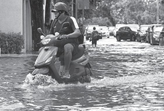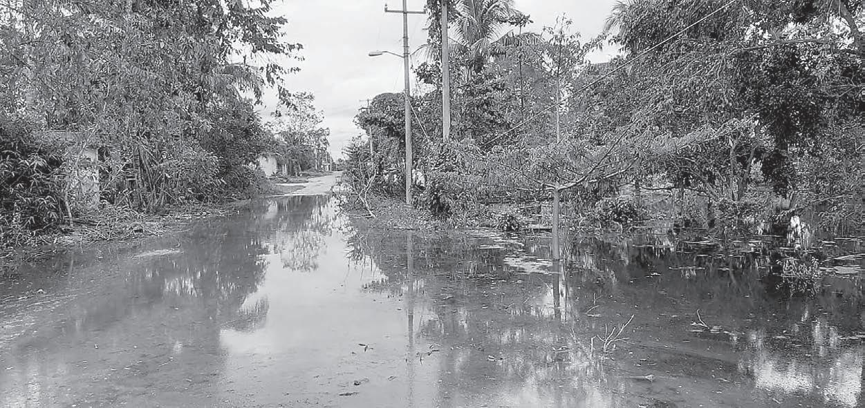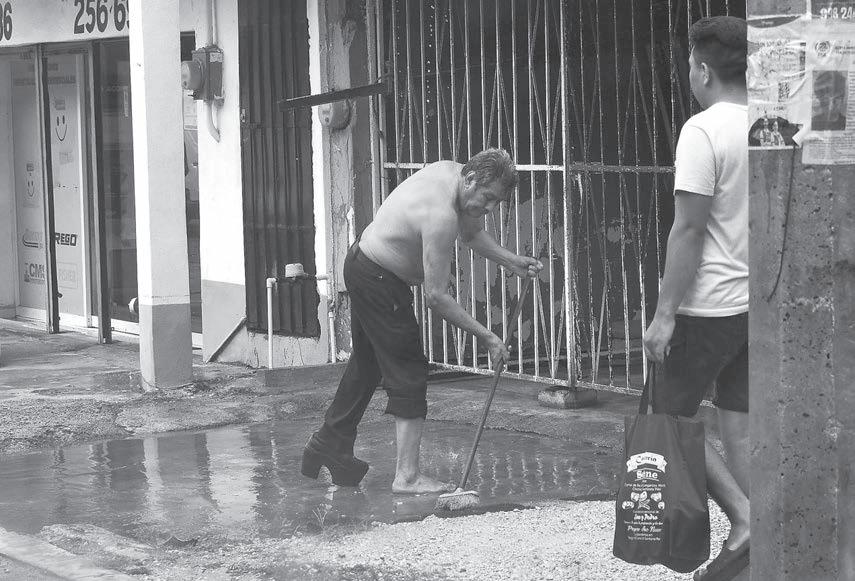 ALGUNOS vecinos entraron en las calles anegadas para quitar la basura de las coladeras.- (M. Hernández)