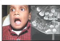 La lesión que afectaba al niño se conoce con el nom bre de odontoma compuesto, un tumor benigno integrado por varios dentículos o dien tes rudimentarios los cuales se encuentran conformados de tejido dental organizado. Se atribuye a traumatismos durante la primera dentición.