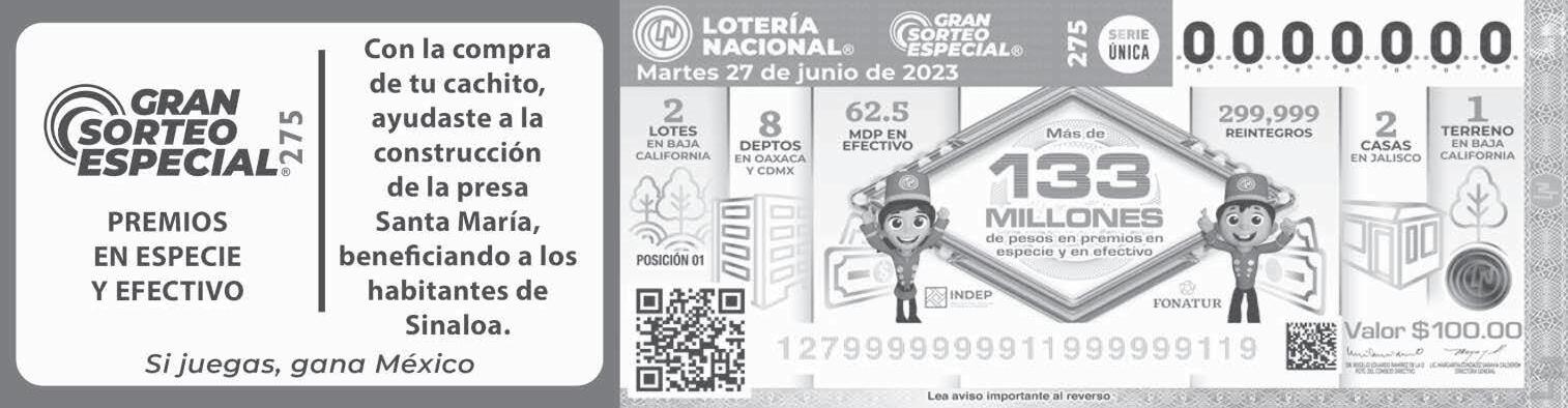 Sigue la transmisión en vivo de los sorteos a través de nuestro sitio www.loterianacional.gob.mx y en nuestras redes loterianacional.electronicos, @LN_electronicos y Lotería Nacional Sorteos Electrónicos. Para mayor información, consulte el reverso de su boleto o volante. Si hubiera alguna diferencia entre los resultados publica-