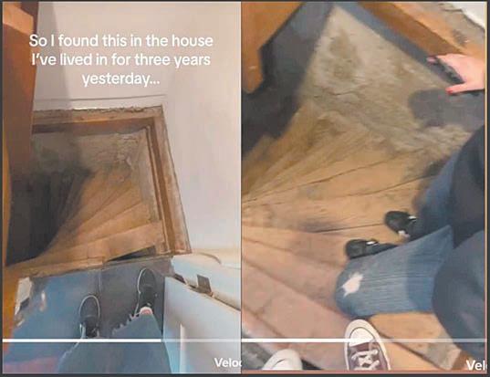 Julia Henning quien vive en Estados Unidos, donde puede ser común este tipo de construcciones, documentó el hallazgo de una pequeña puerta que, al abrirla, descubrió unas escaleras en forma