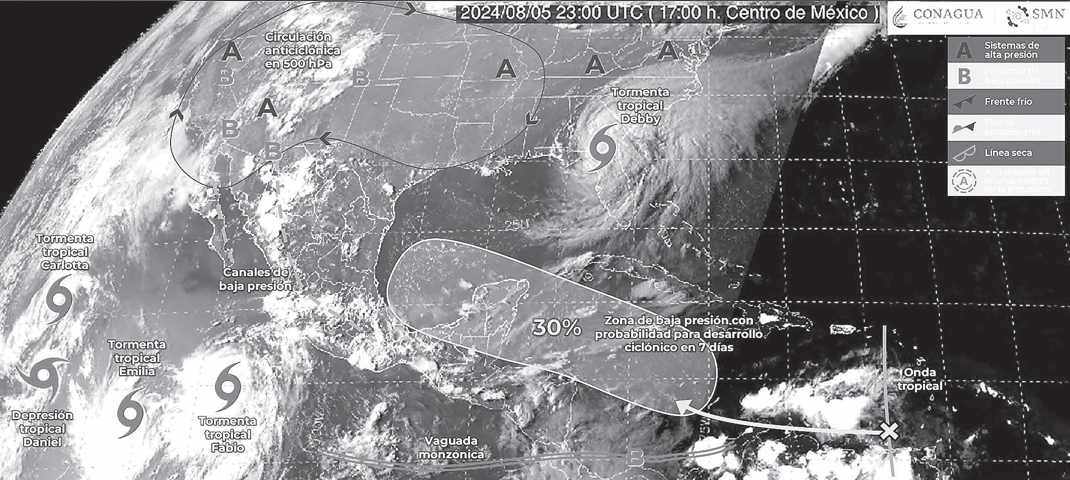 Debby tocó tierra firme en la costa de Florida en el Golfo de México ayer como un huracán de categoría 1, tras lo cual se debilitó a tormenta tropical, y avanza lentamente con rastro de inundaciones. Más de 300 mil clientes estaban ayer sin electricidad en Florida y Georgia, según PowerOutage.us y Georgia Electric Membership Corp. DeSantis dijo que unos 17 mil técnicos estaban