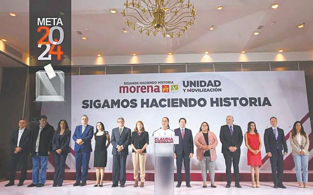 Claudia Sheinbaum Pardo, candidata de la coalición Sigamos Haciendo Historia, integrada por el Movimiento de Regeneración Nacional (Morena), Partido del Trabajo (PT) y Partido Verde Ecologista de México (PVEM), presentó ayer en conferencia de prensa a su equipo de campaña para la contienda por la Presidencia de México.