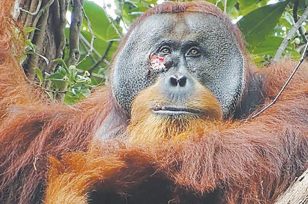 Un orangután pareció tratar una herida con medicina de una planta tropical, en el ejemplo más reciente de cómo algunos animales tratan de sanar sus propios padecimientos con remedios hallados en la naturaleza, reportaron ayer científicos. Los especialistas vieron como el orangután macho adulto arrancaba y masticaba una planta medicinal usada por gente en todo el Sureste asiático para tratar el dolor y la inflamación. El simio, llamado Rakus , seguidamente usó los dedos para untarse la herida en su mejilla derecha con el jugo de la planta. Luego apretó las hojas masticadas sobre la herida, como si fuese