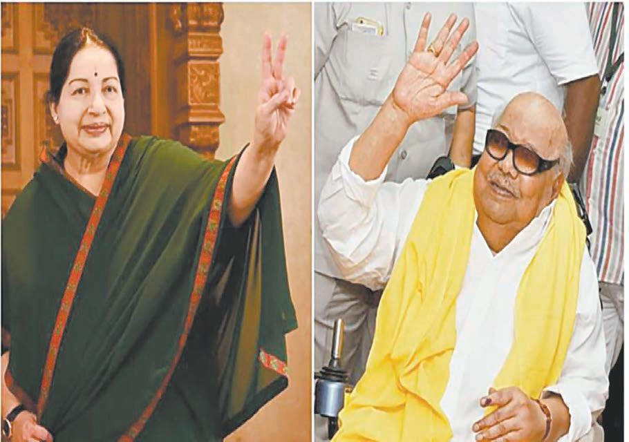 El partido en el poder respondió con un video de su antiguo adversario M. Karunanidhi (a la derecha.), fallecido en el 2018, en el que alaba a su hijo,