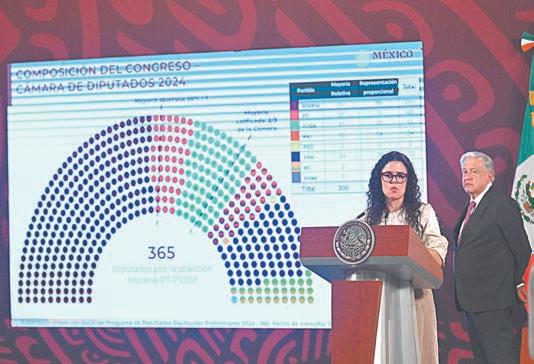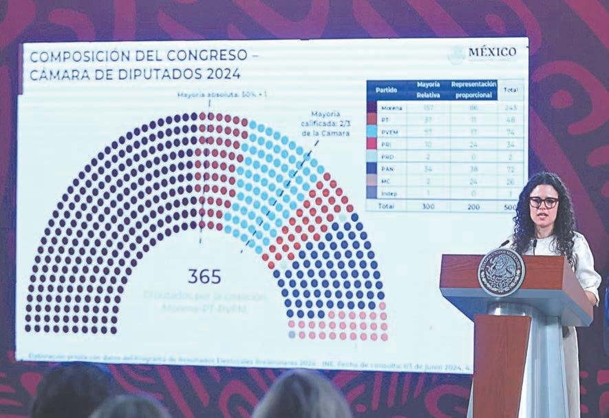 De acuerdo con Luisa María Alcalde, la composición del Congreso sería de 243 diputados por Morena, 48 por el Partido del Trabajo (PT) y 74 por el Partido Verde Ecologista de México (PVEM), lo que implica que los partidos aliados de la Cuarta Transformación tendrán una mayoría calificada en la Cámara de Diputados, es decir, de dos terceras partes, lo que conlleva la posibilidad de llevar a cabo reformas constitucionales. Indicó que el PRI contará con cerca de 34 diputados; el PRD, dos; el PAN, 72; Movimiento Ciudadano, 26; e independientes, uno, para un total de 500 diputados y diputadas. En el caso de la composición de la Cámara de Senadores, Alcalde dijo que aproximadamente, Morena tendrá 60 senadores por Morena; 8 por el PT; 14 por el PVEM; 17 por el PRI; dos por el PRD; 22 por el PAN y cinco por Movimiento Ciudadano, para dar un total de 128 senadores.