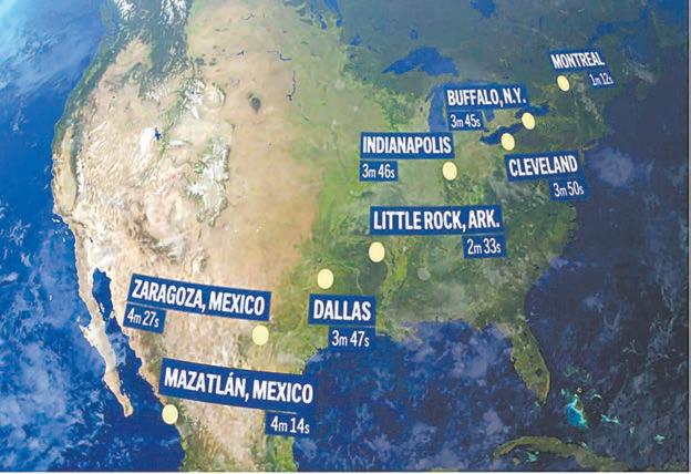 El evento comenzó a ser visible primero en la costa Oeste de México, a partir de las 18:07 GMT. La trayectoria cruzó luego 15 Estados de la Unión Americana, desde Texas hasta Maine, antes de finalizar su recorrido en el Este de Canadá.