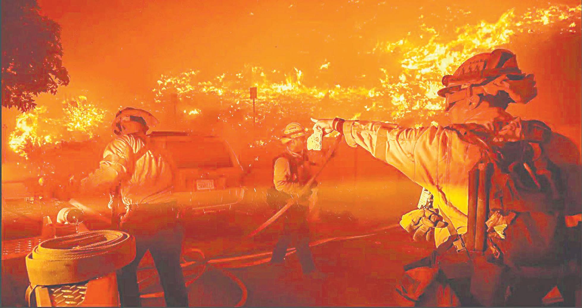 Grupos de bomberos combaten por aire y por tierra un feroz incendio forestal que se propaga velozmente por el exclusivo balneario de Malibú, en la costa Oeste estadounidense, donde miles de personas recibieron órdenes de evacuación.