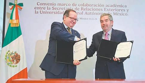 Resaltó los múltiples convenios y proyectos conjuntos entre la UNAM y la SRE que han fortalecido la política exterior mexicana con un enfoque basado en la ética, el conocimiento, el pensamiento crítico, el rigor académico y la pluralidad. El convenio establece que la UNAM y la Cancillería Mexicana realizarán jornadas de asesoría, orientación jurídica y psicológica a las personas migrantes mexicanas, conforme a la normativa nacional y supranacional para la protección de las personas migrantes. (Agencias)
