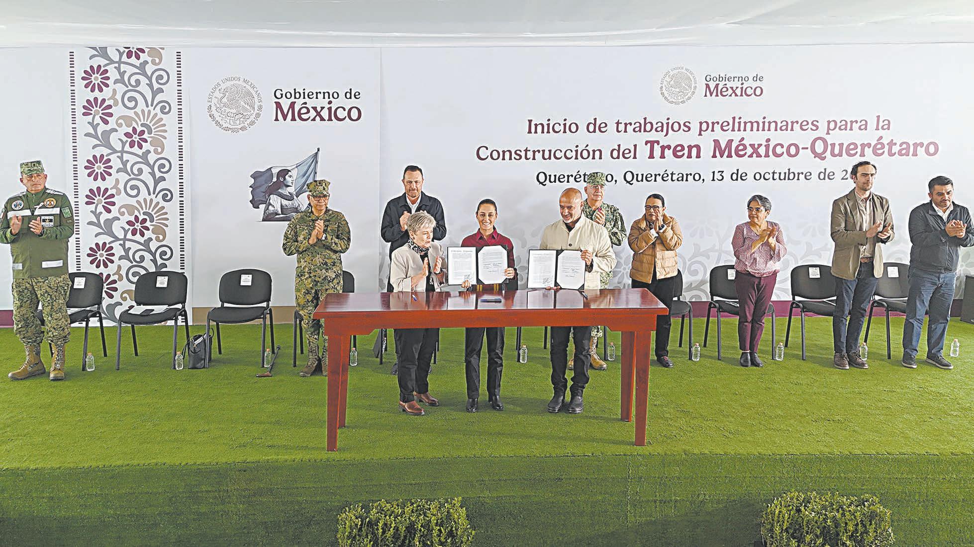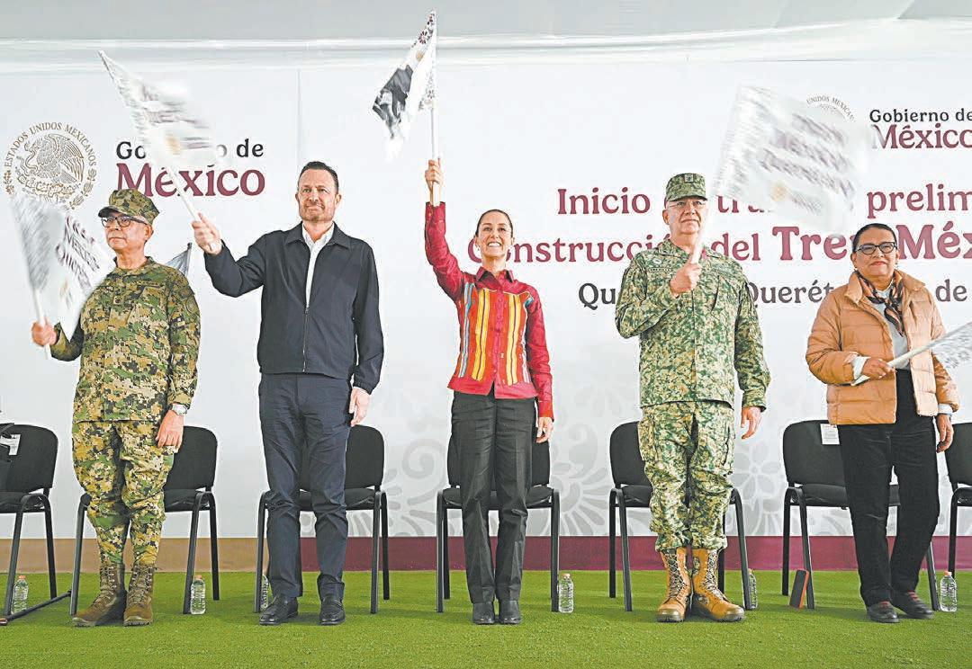 QUERÉTARO, Qro.- La presidenta Claudia Sheinbaum Pardo dio ayer el banderazo a los trabajos preliminares para la construcción del Tren México-Querétaro, los cuales estarán a cargo de la Secretaría de la Defensa Nacional (Sedena) con el objetivo de que esté listo en el 2029. En la Unidad Deportiva ma, Sheinbaum Pardo informó que el tramo del Tren México-Querétaro tendrá tres estaciones: Buenavista, San Juan del Río y Querétaro, pero que el objetivo es que tenga dos ramales para que llegue a Guadalajara, Jalisco; Nogales, Sonora, y Nuevo Laredo, Tamaulipas.