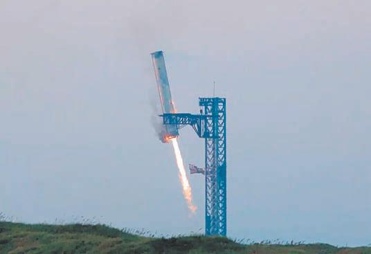 Antes de que el propulsor bautizado Super Heavy tocara el suelo cuando regresaba a su plataforma de lanzamiento, unos brazos mecánicos instalados en la torre, apodados los palillos, se cerraron sobre el aparato y lo inmovilizaron, según un video difundido por la empresa del