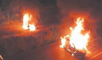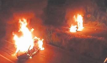 Posteriormente, otro grupo de jóvenes atravesó dos unidades comerciales, secuestradas en días pasados, sobre la carretera, a las que les prendieron fuego.