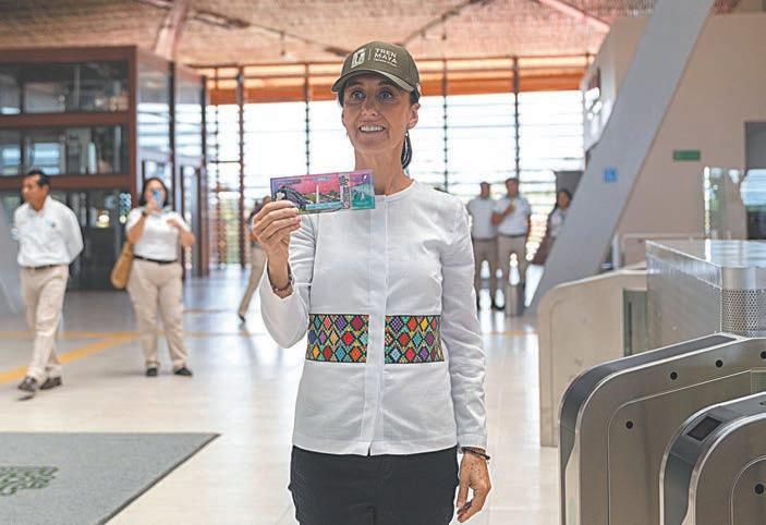 que han participado en el proyecto. Sheinbaum Pardo recibió el boleto de ingreso a las instalaciones y, antes de pasar por el torniquete de entrada, posó para la foto con el ticket en mano y una gorra del Tren Maya. Con esta etapa, que será inaugurada formalmente hoy, se cerrará el circuito de los mil 554 kilómetros del Tren Maya, que finalmente recorrerá todo el trazo que pasa por los estados de Chiapas, Tabasco, Campeche, Yucatán y Quintana Roo. En el convoy también acompañan a la Presidenta, el gobernadorde Chiapas, Eduardo Ramírez Aguilar, así como funcionarios de su gabinete legal y ampliado, y directores de empresas constructoras del Tren Maya. (Agencias)