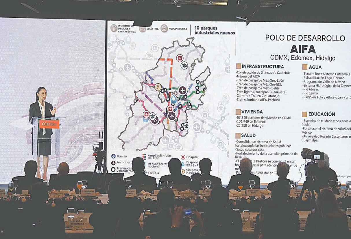 CLAUDIA SHEINBAUM PRESIDENTE DE MÉXICOPor otro lado, Sheinbaum pidió a los empresarios trabajar en la relocalización de empresas y polos del bienestar, haciendo énfasis en impulsar la zona del Aeropuerto Internacional Felipe Ángeles. Abundó que deberá haber vi-