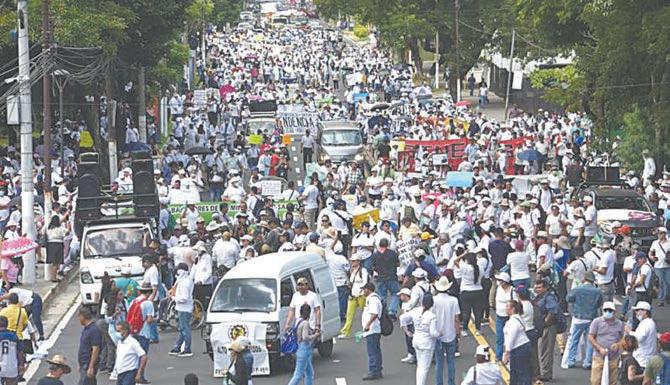 SAN SALVADOR.- Médicos y maestros marcharon ayer en San Salvador para exigir al Gobierno de Nayib Bukele el pago de un escalafón suprimido en el proyecto de presupuesto del Estado para el 2025.