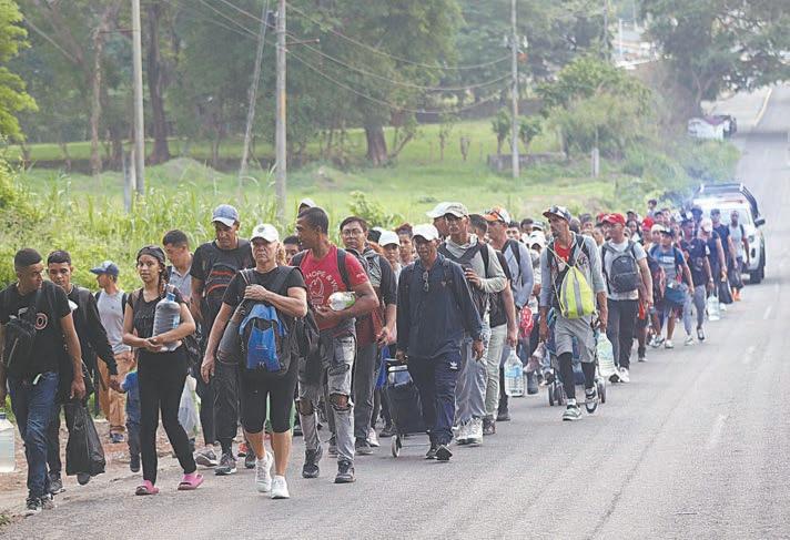 TAPACHULA, Chis.- Una cara vana con cientos de migrantes salió de Tapachula, días después del en cuentro entre los presidentes de Mé xico, Andrés Manuel López Obrador, y de Guatemala, Bernardo Arévalo. El nuevo contingente está com puesto en su mayoría por migrantes de Cuba, Haití, Centroamérica, Bra sil y Colombia, quienes salieron ca minando desde Tapachula alrededor de las 5:40 horas con carriolas, mo chilas en mano, botellas de agua e in certidumbre, porque no les resolvie ron sus trámites para regularizarse. En este grupo multitudinario ca mina el migrante brasileño Wagner, quien contó que se unió a esta carava na porque venía solo y temía enfren tar diversos peligros, por lo que ahora se siente más seguro yendo en grupo.