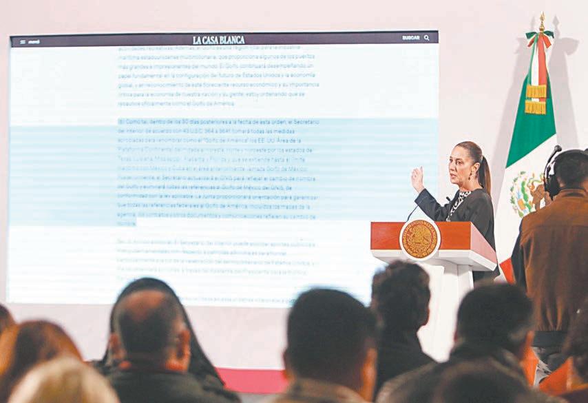 personas extranjeras en movilidad irregular a sus países de origen. Por otro lado, puntualizó que el decreto que cambia el nombre del Golfo de México a “Golfo de América”, es una modificación que se hizo en la plataforma continental de los Estados Unidos; sin embargo, para México y para el resto del mundo seguirá llamándose Golfo de México.