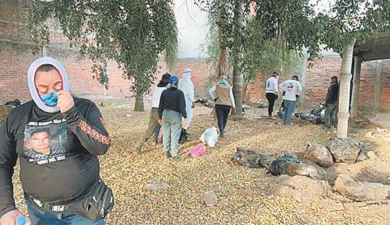 Además, las imágenes muestran numerosos bultos en bolsas de plástico negras amarradas con cinta plateada, donde presumiblemente hay cuerpos o restos humanos. El conteo de las buscadoras suma 27 bolsas de plástico, huesos al aire libre, botellas con ácido muriático, ropa esparcida por el lugar, y por los menos siete hoyancos que podrían servir como fosas clandestinas.