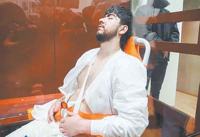 contra. El cuarto, Faizov, fue llevado a la Corte en silla de ruedas directamente desde un hospital, y permaneció sentado y con los ojos cerrados durante la audiencia. Fue atendido por médicos mientras estaba en el tribunal, donde vestía una bata y pantalones de hospital, y se le vio con varios cortes.