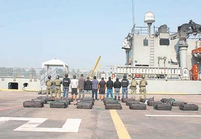 Posteriormente, se desplegó personal naval a bordo de unidades de superficie (buques), asegurando dos embarcaciones; una de ellas con dos tripulantes a bordo, quienes transportaban 11 bultos, y la segun-