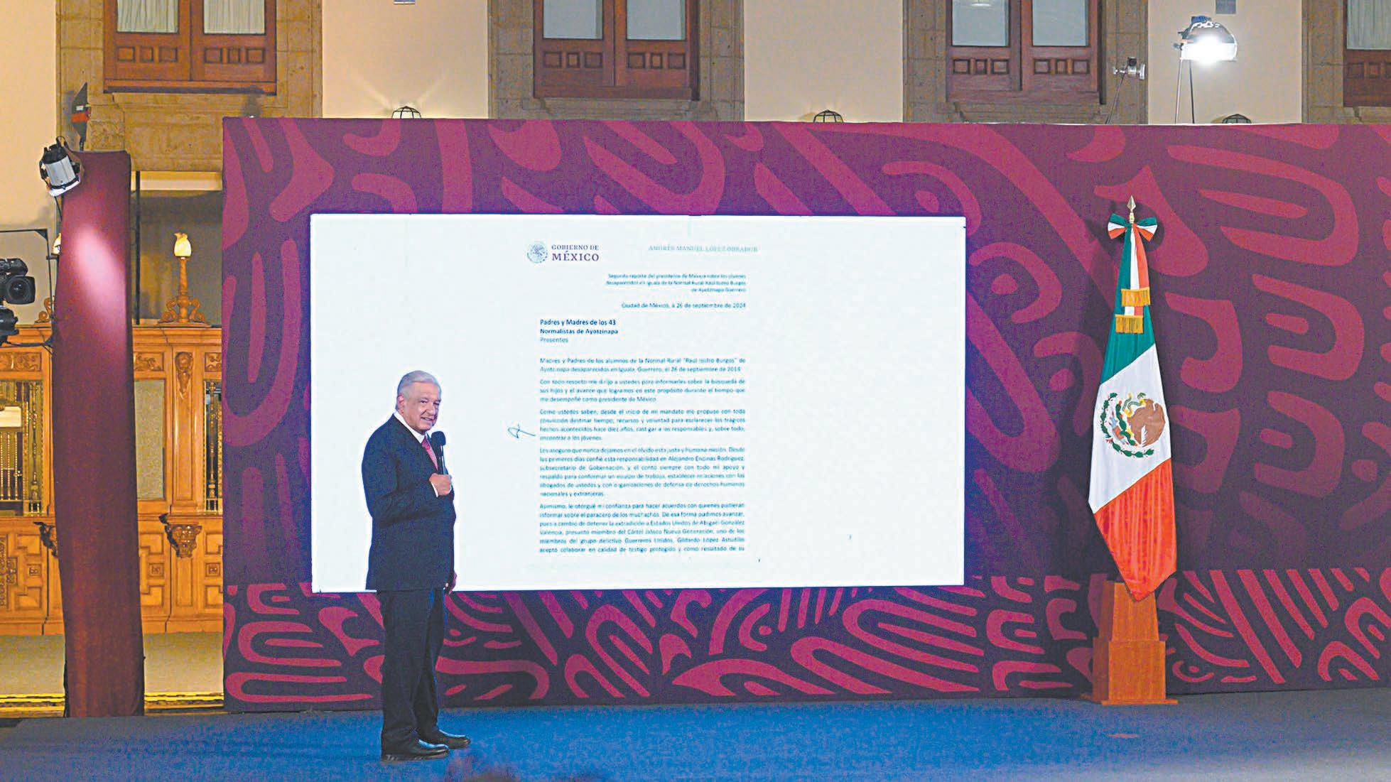 CIUDAD DE MÉXICO.- El presidente Andrés Manuel López Obrador reveló ayer que, a cinco días del final de su Gobierno y a uno del décimo aniversario de la desaparición de los 43 estudiantes normalistas de Ayotzinapa, envió una nueva carta a los padres de los jóvenes y manifestó que el caso “no es un expediente cerrado”, por lo que aseveró que la investigación seguirá durante la administración de Claudia Sheinbaum.