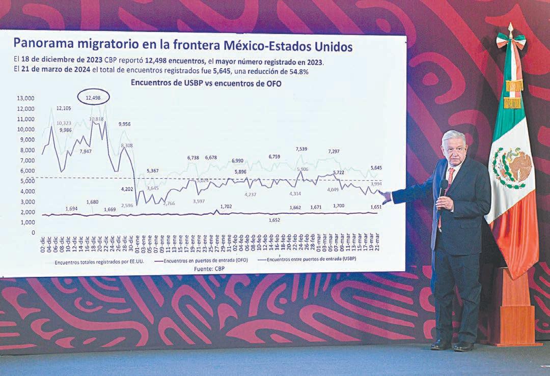 En el Salón Tesorería, el Mandatario federal respaldó sus declaraciones con una gráfica que aseguró que, mientras al 18 de diciembre pasado la Oficina de Aduanas y Protección Fronteriza (CBP, en inglés) reportó 12 mil 498 encuentros en la frontera Norte del país, para el 21 de marzo la cifra bajó a 5 mil 645 encuentros.