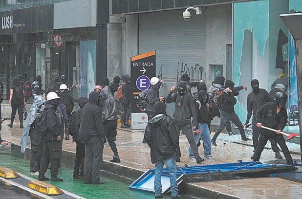 Sólo algunos minutos bastaron para que el denominado bloque negro comenzara a realizar destrozos y pintas en comercios y bancos que se encontraban a su paso. De poco ayudaron los tapiales instalados en las fachadas de los negocios, pues con relativa facilidad fueron retirados por los manifestantes.