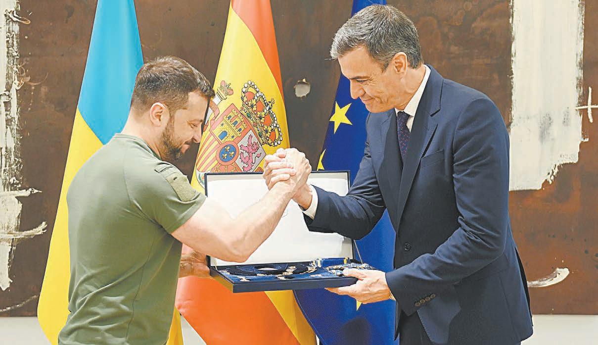 “Debemos intensificar nuestro trabajo conjunto con nuestros socios para lograr más: seguridad y coer ción tangible a Rusia para lograr la paz por todos los medios”, instó el Mandatario ucraniano en una rueda de prensa junto al presidente del Go bierno español, Pedro Sánchez. Es necesario “presionar no sólo a Rusia, sino también a nuestros socios, para que nos den la oportunidad de defendernos”, apuntó, al reclamar de nuevo sis temas de defensa antiaérea para poder interceptar las más de 3 mil bombas guiadas lanzadas por Rusia sobre su país cada mes.