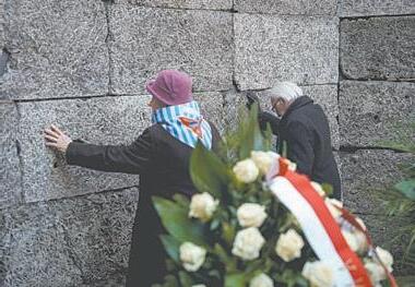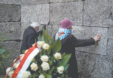 cualquier otra forma de odio”, dijo. Algunos sobrevivientes llevaban gorras y pañuelos a rayas azules y blancas, símbolo de sus antiguos uniformes. Al pie del muro, que tocaron con una mano en silencio, encendieron velas en memoria de los fallecidos.