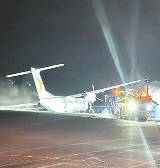 con el tren de aterrizaje”. El avión, un De Havilland Canada Dash 8-400, no logró desplegar correctamente uno de sus neumáticos, lo que provocó que la aeronave se deslizara a un ángulo de unos 20 grados hacia la izquierda.
